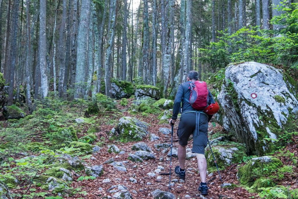 Once into the forest the trail down does not let up. It continues a relentless descent down every kind of slippery surface – loose rocks, wet lime stone, fallen leaves and tree roots.