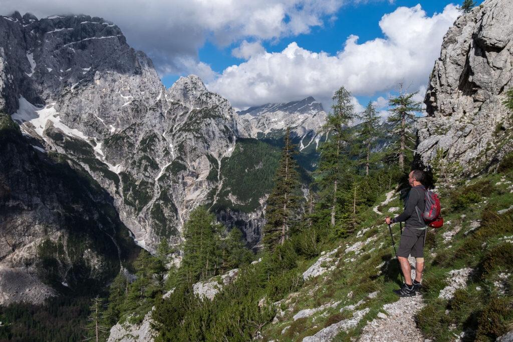 The hardest and most rewarding hike of our week in Kranjska Gora, has amazing vistas of the Julian Alps. Although this hike in the guidebook starts from Kranjska Gora we cut off the to-and-from town part (see below for parking advice). Otherwise we followed the directions as described. The trail was well signed but this early in the season it was not well maintained.
