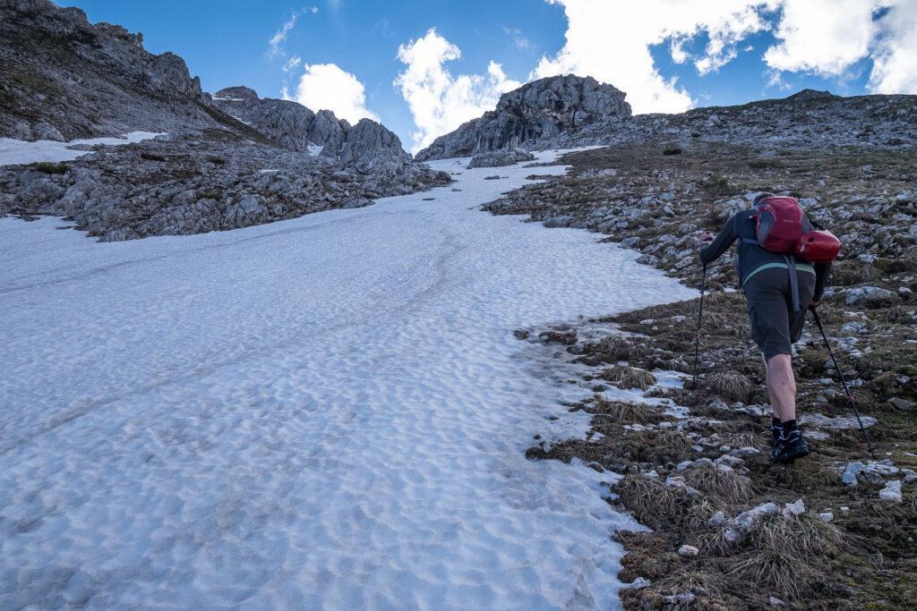 Going down the “short way” descends about 1400 meters in 4k and was awful without crampons. It starts with a long steep section of snow and scree. With crampons it would have been manageable but the scree still would have made it unpleasant. I think that when the trail is better maintained there is actually a trail of switchbacks that go down this hillside.